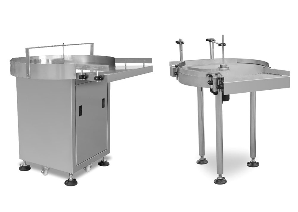 Turntables are used to deliver bottles or other containers to tablet counters, fillers and to other points in the filling and packaging process. By adjusting the speed of the turntable rotation, the feeding rate of the empty bottles in the packaging process is carefully regulated.